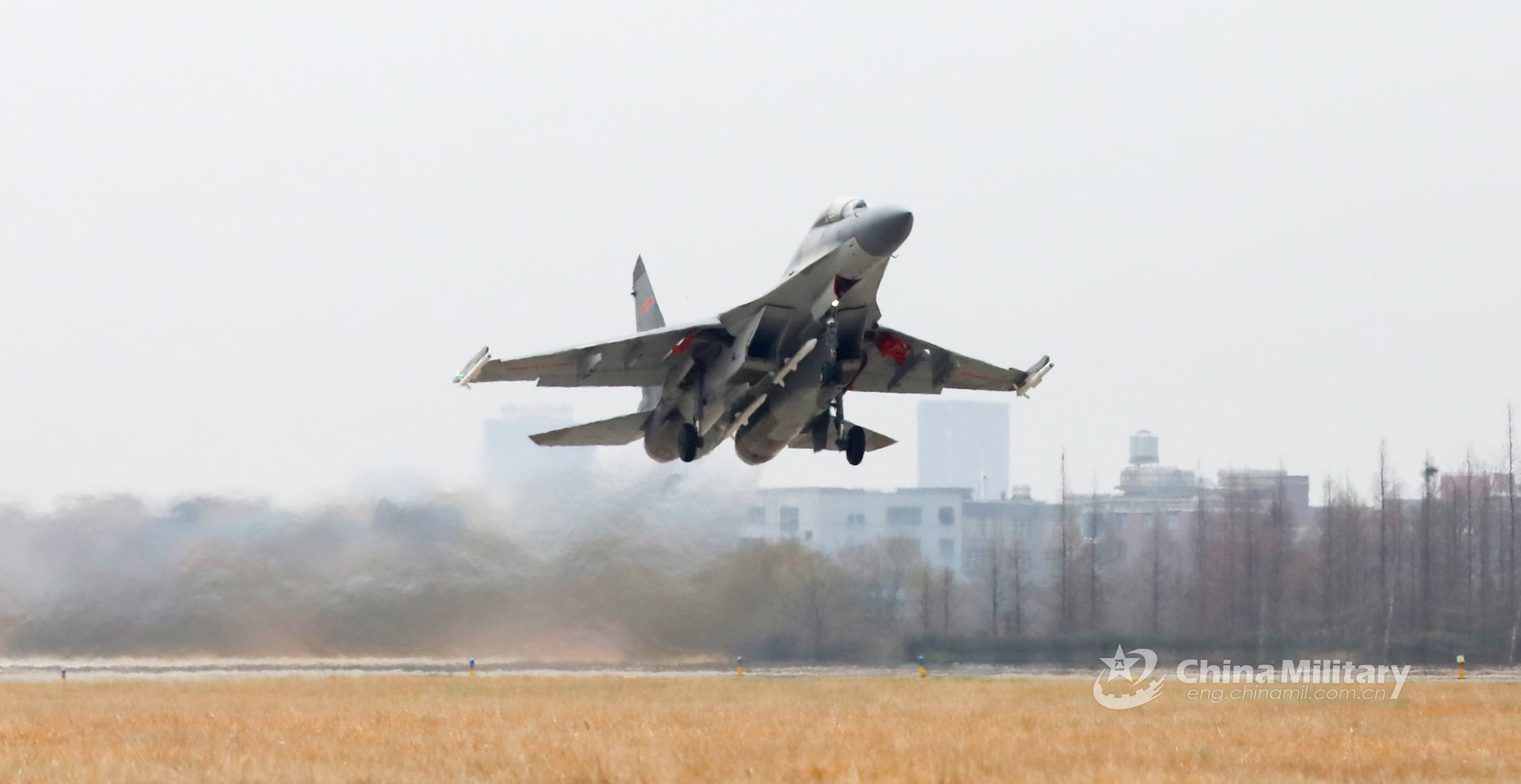 A J-16 fighter jet attached to an aviation brigade of the air force under the PLA Eastern Theater Command takes off from the runway during multiple training sorties on February 16, 2021. (eng.chinamil.com.cn/Photo by Li Yehong)