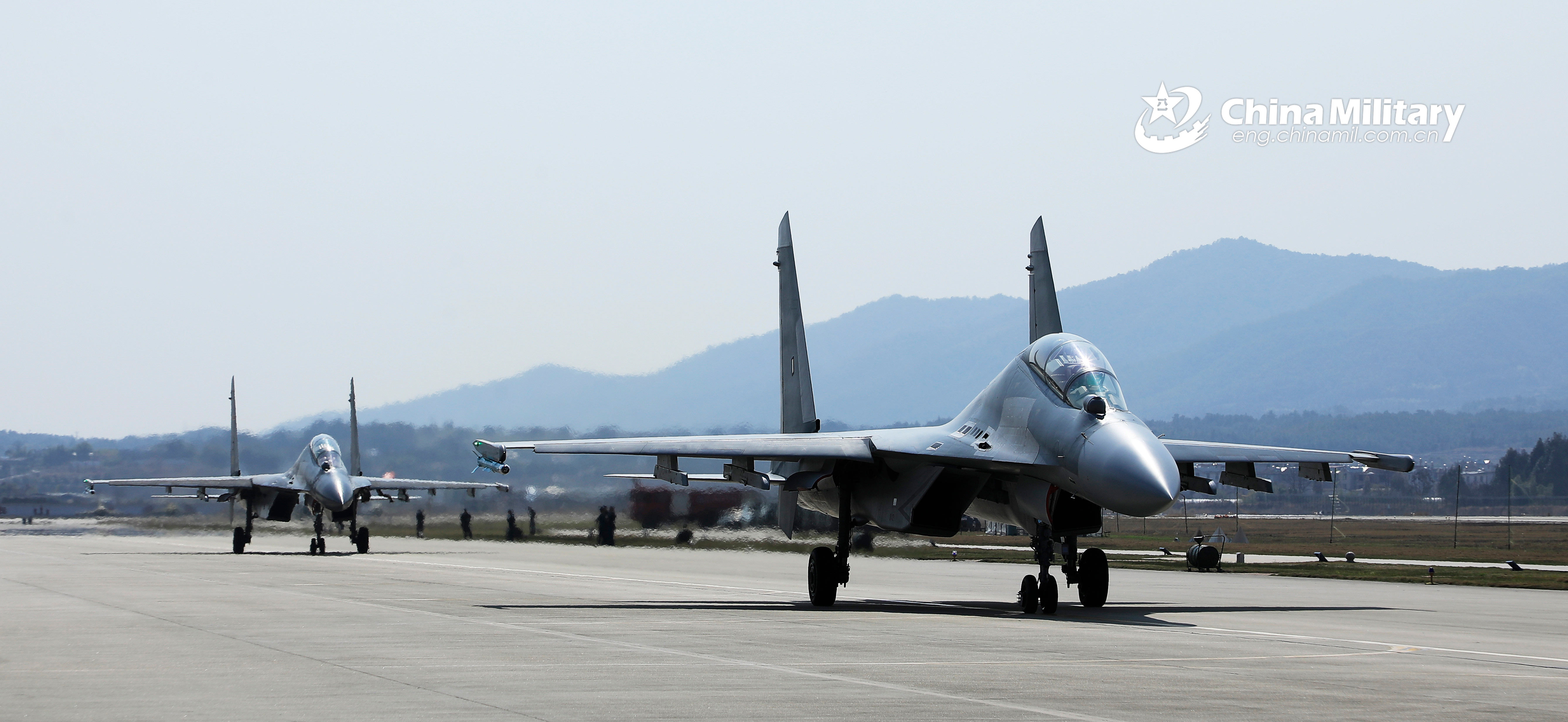 Two fighter jets attached to an aviation brigade of the air force under the PLA Eastern Theater Command taxi on the flightline before takeoff during an aerial combat flight training exercise on February 21, 2021. (eng.chinamil.com.cn/Photo by Fu Guannie and Wang Yi)