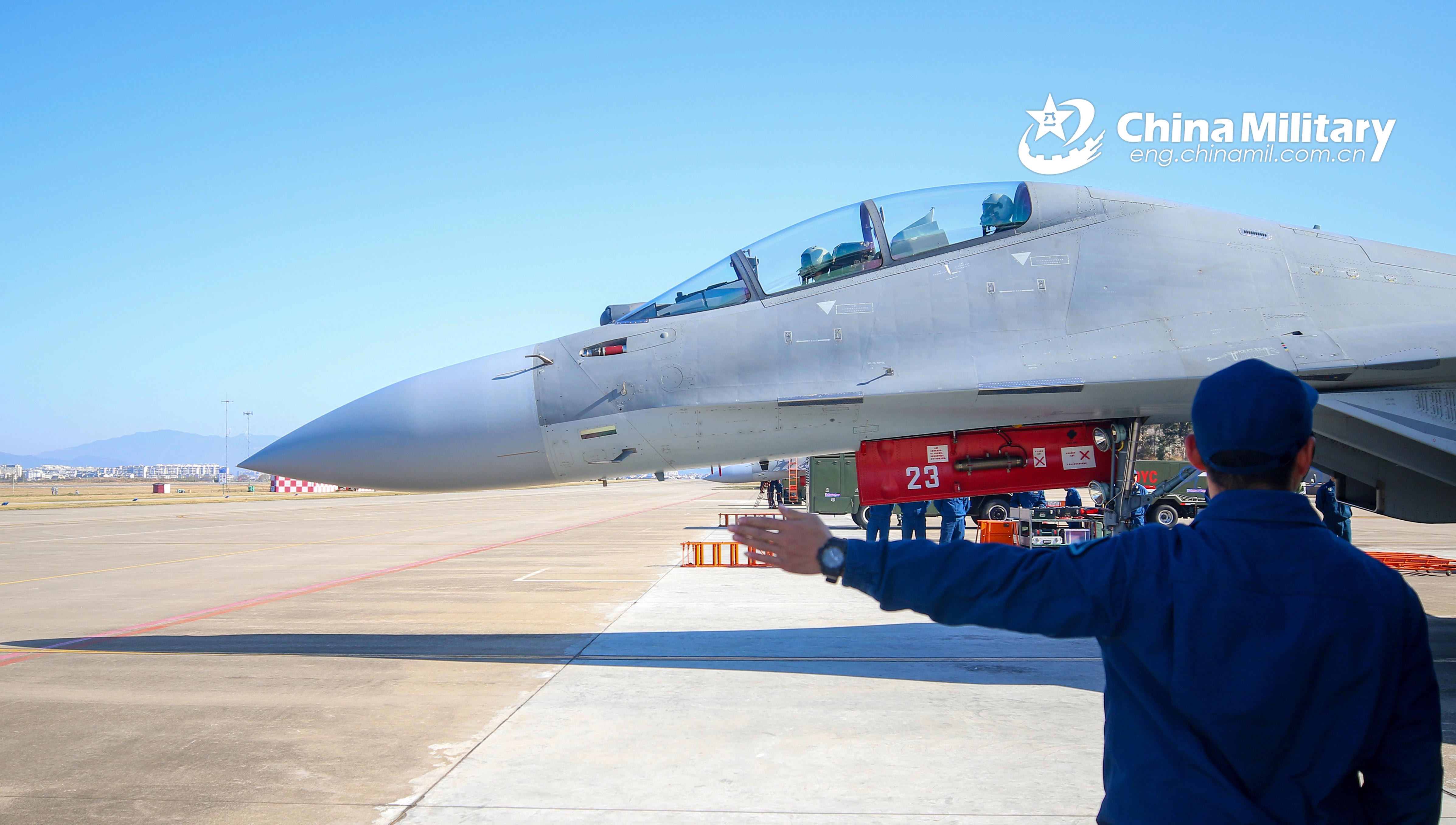 A mechanic assigned to an aviation brigade of the air force under the PLA Eastern Theater Command motions a pilot to taxi the fighter jet onto the runway during an aerial combat flight training exercise on February 21, 2021. (eng.chinamil.com.cn/Photo by Fu Guannie and Wang Yi)