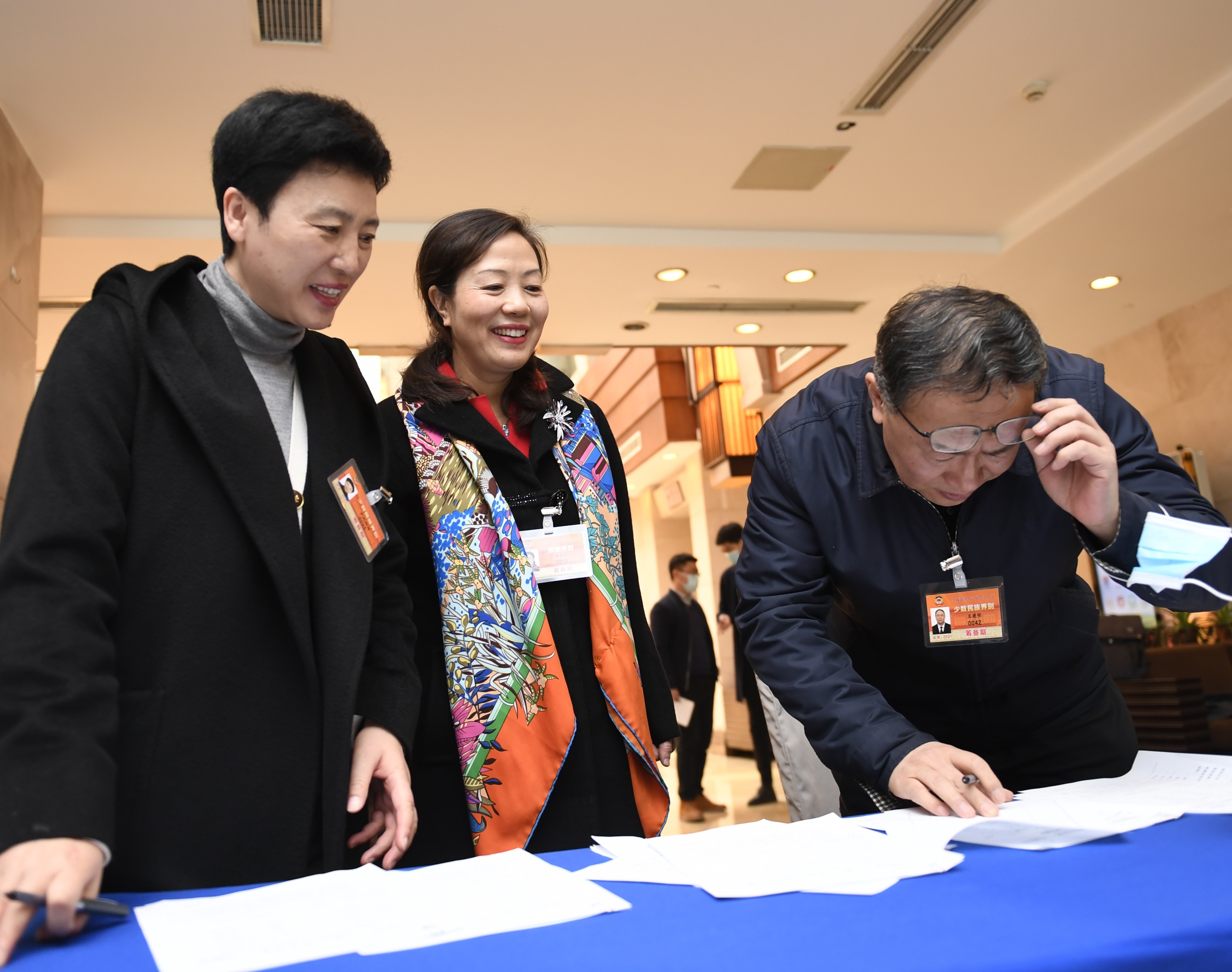 (From left) Doryang Lhamo, Xie Shanghua and Wang Jianming, all members of the CPPCC National Committee from Sichuan province, co-sign a proposal in Chengdu, Sichuan, on Tuesday, before heading to Beijing for the top political advisory body's annual meeting. CHINA DAILY