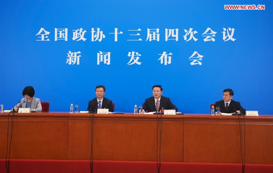 Guo Weimin (2nd R), spokesperson for the fourth session of the 13th National Committee of the Chinese People's Political Consultative Conference (CPPCC), briefs media on the session through video link due to epidemic response during a press conference in Beijing, capital of China, March 3, 2021. The National Committee of the CPPCC held a press conference on Wednesday afternoon, ahead of the top political advisory body's annual session. (Xinhua/Xing Guangli)