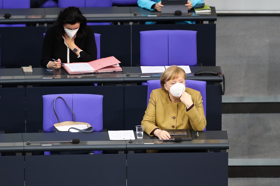 German Chancellor Angela Merkel (R) sits on chair with a face mask after giving a speech on measures to contain the COVID-19 pandemic to Germany's Federal Parliament (Bundestag) in Berlin, capital of Germany, Feb. 11, 2021. (Xinhua/Shan Yuqi)
