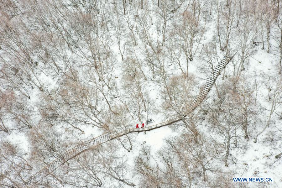 Aerial photo taken on March 5, 2021, shows the snow covered Sumu Mountain in Xinghe County of Ulanqab, north China's Inner Mongolia Autonomous Region. (Xinhua/Liu Yide)
