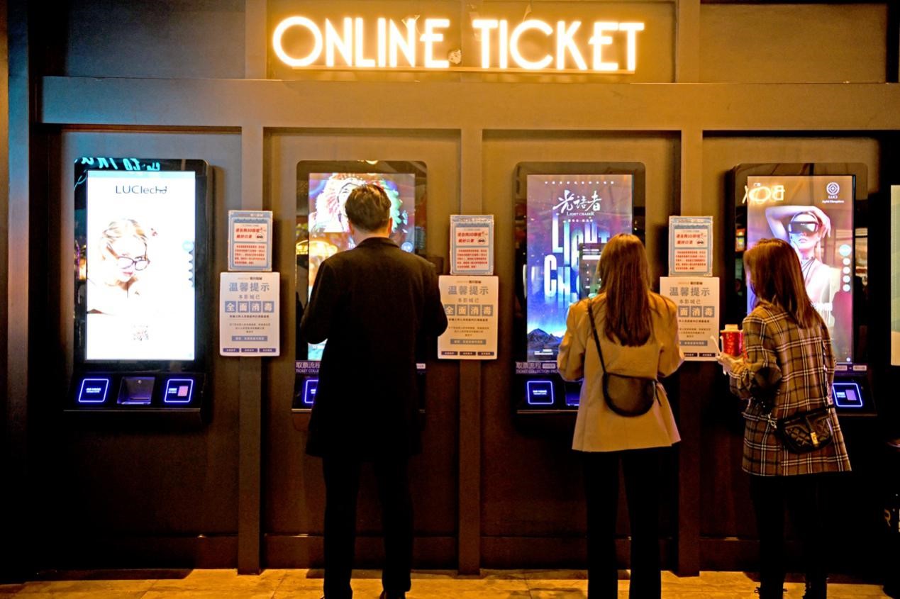 Young citizens buy movie tickets from ticket dispensing machines at a cinema in Huainan, east China's Anhui Province, Feb. 14. (Photo by Chen Bin/People's Daily Online)