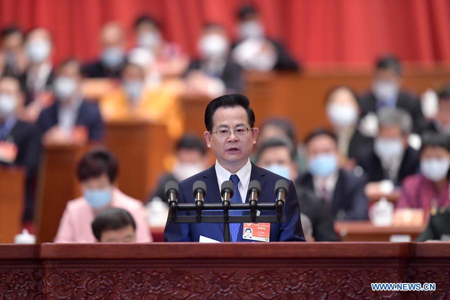 On behalf of the Central Committee of the Revolutionary Committee of the Chinese Kuomintang, Liu Jiaqiang, a member of the 13th National Committee of the Chinese People's Political Consultative Conference (CPPCC), delivers a speech at the second plenary meeting of the fourth session of the 13th CPPCC National Committee at the Great Hall of the People in Beijing, capital of China, March 7, 2021. (Xinhua/Li He)