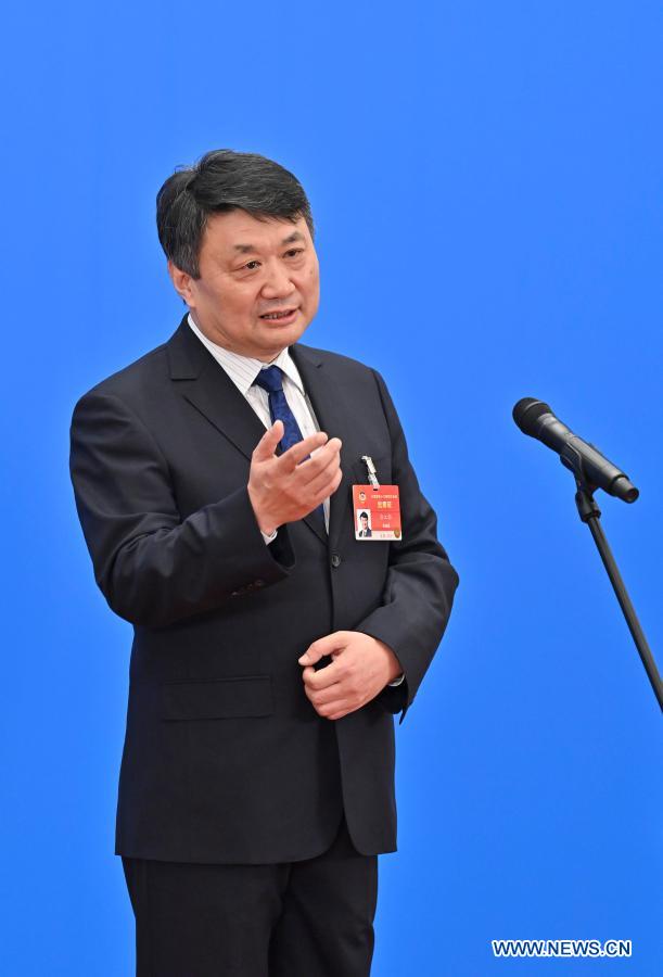 Tang Jiangpeng, a member of the 13th National Committee of the Chinese People's Political Consultative Conference (CPPCC), gives an interview via video link ahead of the second plenary meeting of the fourth session of the 13th CPPCC National Committee at the Great Hall of the People in Beijing, capital of China, March 7, 2021. (Xinhua/Li Xin)