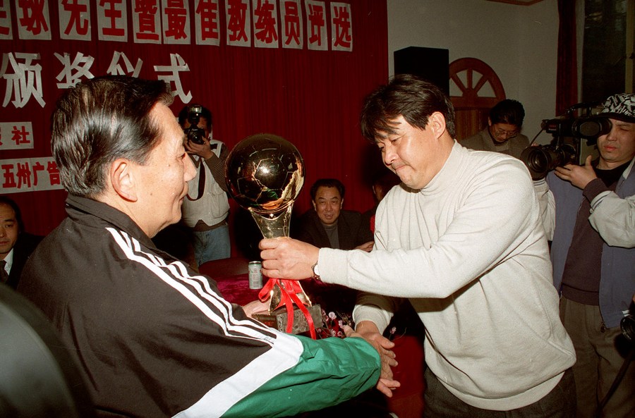 Chi Shangbin of Dalian Wanda receives his honor as the Coach of the Year while Fan Zhiyi of Shanghai Shenhua becomes the Footballer of the Year in 1996 in an annual soccer awarding ceremony at the Haigeng training center in Kunming on November 11, 1997. (Wang Changshan/Xinhua)