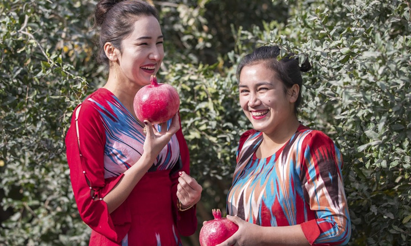 Farmers pick megranates in Pishan County of Hotan, northwest China's Xinjiang Uygur Autonomous Region, Oct. 8, 2020.(Photo: Xinhua)