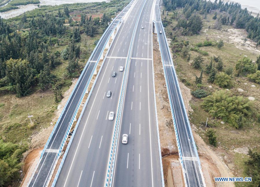 Aerial photo taken on Feb. 6, 2021 shows Haiwen Bridge and Haiwen Bridge-Beigang Island ramp bridge in Haikou, south China's Hainan Province. The ramp project recently opened to traffic. It connects Haiwen Bridge with Beigang Island, marking the end of the days when residents on the island could only travel outside by ferryboat. (Xinhua/Pu Xiaoxu)