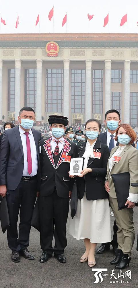Musajan Nurdun, Cui Jiuxiu, Memet Jume, and Dolatman Kamik, deputies to the National People's Congress (NPC) from northwest China's Xinjiang Uygur Autonomous Region, pose for a picture in front of the Great Hall of the People with a photo of Laqin Bayaka, before attending the fourth session of 13th NPC, March 5. (Photo/www.ts.cn)