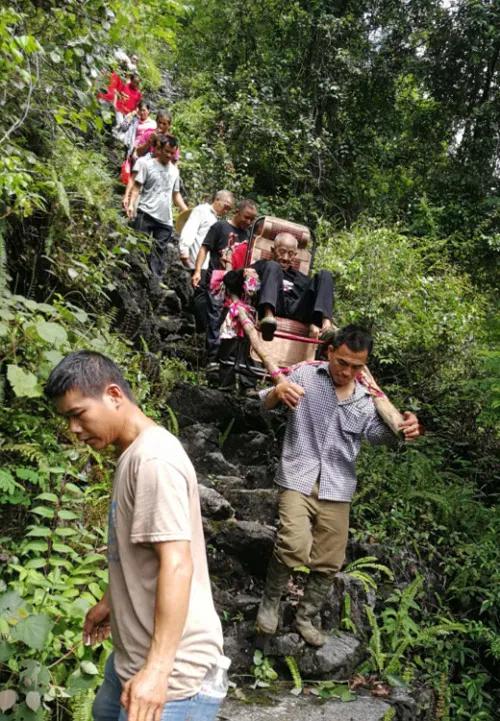 Photo shows local officials and villagers carrying Tan Yunri down the mountain. (Photo/Courtesy of the publicity department of the Communist Party of China Huanjiang county committee)