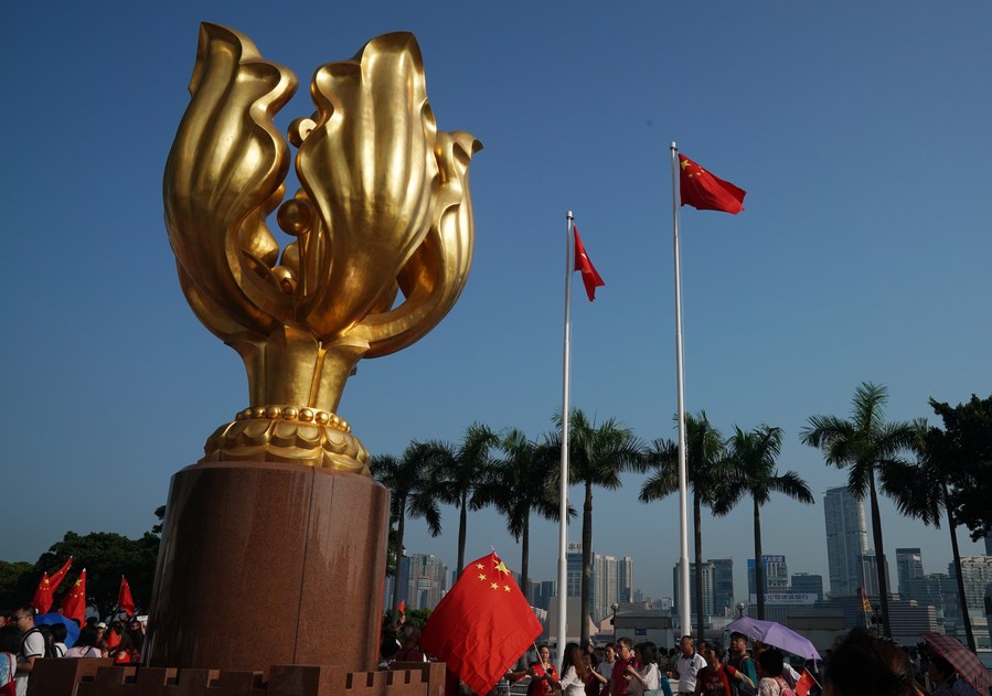 Photo taken on July 14, 2020 shows the Golden Bauhinia Square in south China's Hong Kong. (Xinhua/Wu Xiaochu)