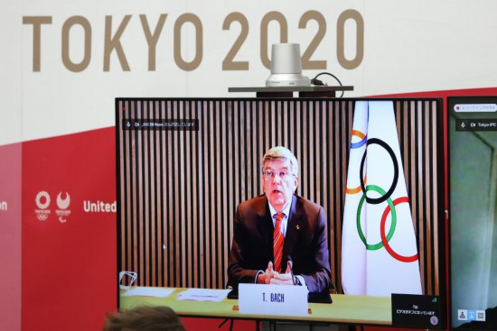 Thomas Bach, president of the International Olympic Committee (IOC), speaks via teleconference during the five-party meeting at the Tokyo 2020 headquarters in Tokyo, Japan, on March 3, 2021. (Xinhua/Du Xiaoyi)