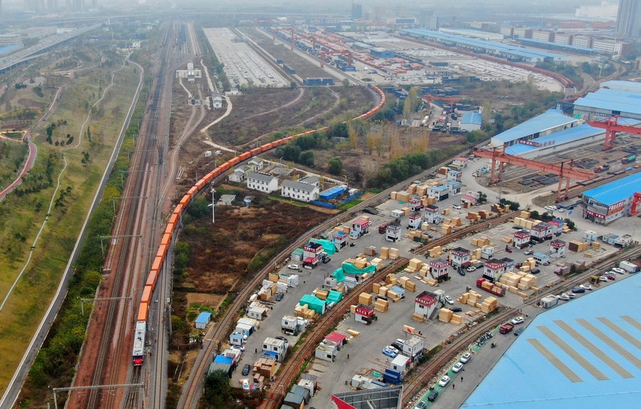 Aerial photo shows a China-Europe freight train bound for Helsinki, Finland, departing from Putian Station of Zhengzhou, central China's Henan Province, Nov. 20, 2020. (Xinhua/Hao Yuan)