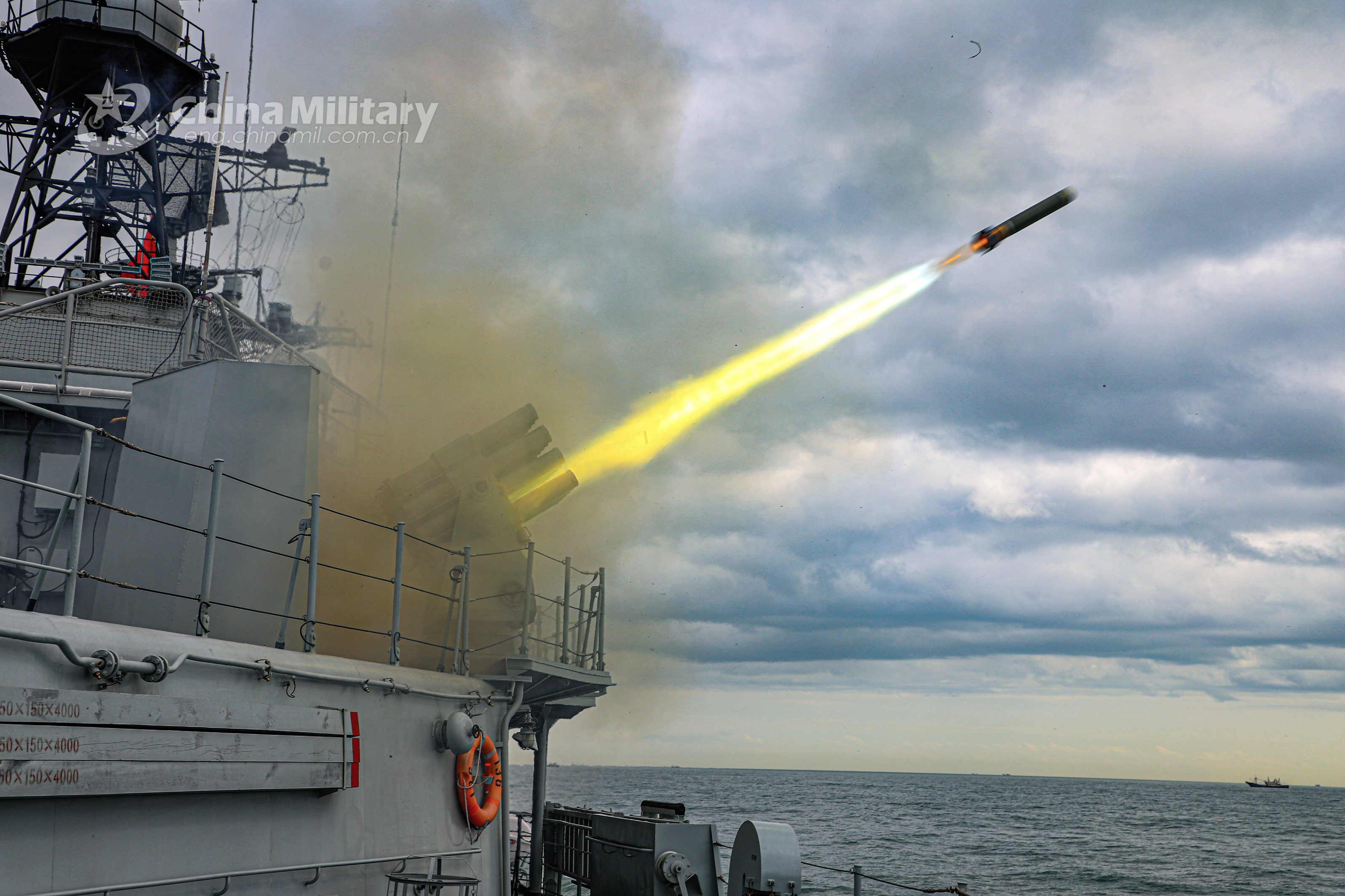 The guided-missile destroyer Taiyuan (Hull 131) attached to a naval destroyer flotilla under the PLA Eastern Theater Command fires jamming bombs to mask the movement and avoid the simulated missile attack during a maritime live-fire operation in waters of the East China Sea in late January, 2021. (eng.chinamil.com.cn/Photo by Li Ning)