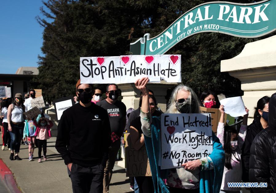 People take part in a rally against anti-Asian hate crimes in San Mateo, California, the US, on Feb 27, 2021. [Photo/Xinhua]