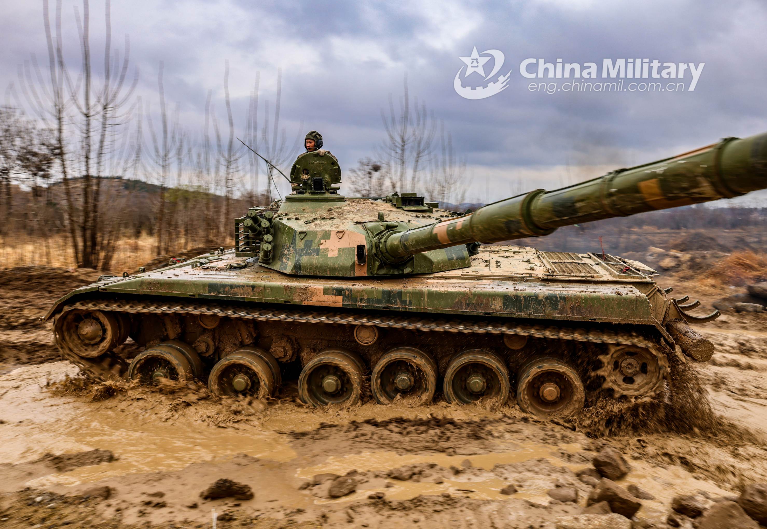 A main battle tank attached to a brigade under the PLA 71st Group Army passes over a shallow trench while rumbling on the muddy road during a coordinated driving skills training exercise on March 1, 2021. (eng.chinamil.com.cn/Photo by Lin Min)