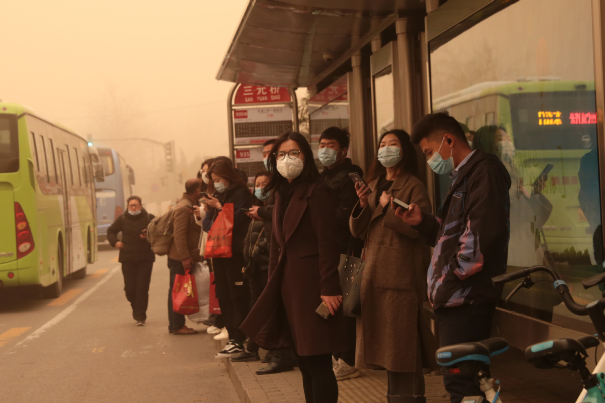 People wait for the bus at a bus stop during a sandstorm in Beijing on March 15, 2021. [Photo by Wu Xiaohui/chinadaily.com.cn]