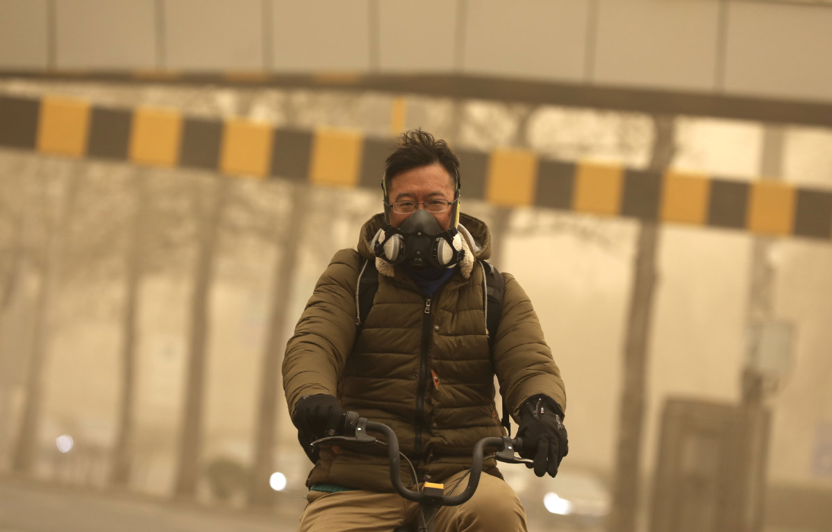 A resident rides a bicycle during a sandstorm in Beijing on March 15, 2021. [Photo by Zhu Xinxing/chinadaily.com.cn]