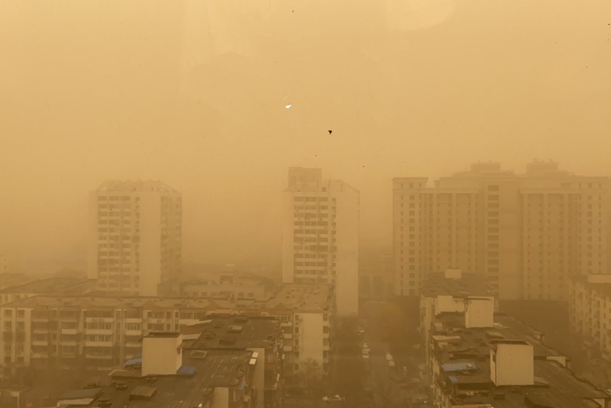 A residential community in Chaoyang district is engulfed in dust during a sandstorm in Beijing on March 15, 2021. [Photo by Chen Zebing/chinadaily.com.cn]