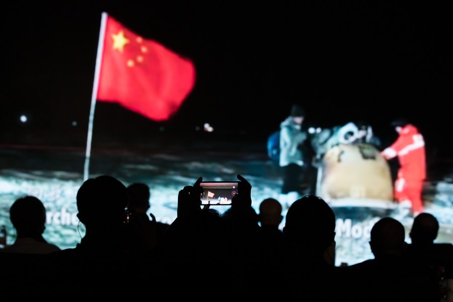 Diplomats and representatives from foreign countries and international organizations watch videos on the Chang'e-5 lunar mission at the National Astronomical Observatories of China under the Chinese Academy of Sciences in Beijing, capital of China, Jan. 18, 2021. (Xinhua/Jin Liwang)