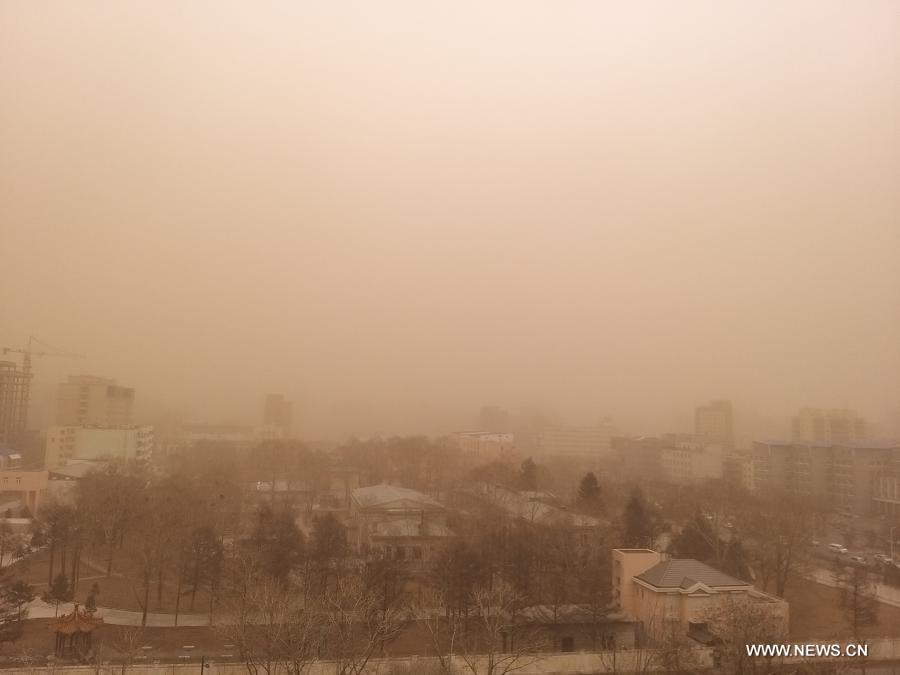 Photo taken on March 14, 2021 shows a view of the dust storm in Ulan Bator, Mongolia. The death toll rose to nine from heavy dust and snow storms that hit large parts of Mongolia on the weekend, the country's National Emergency Management Agency said Monday. (Xinhua/Asigang)