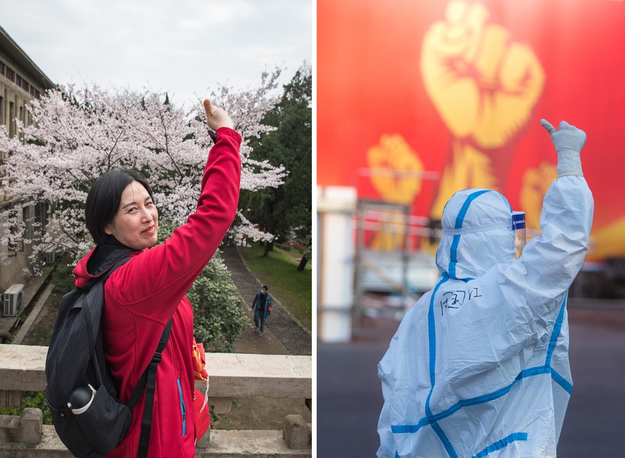 The left photo shows medical worker Zhou Guohong posing with cherry blossom in Wuhan University in Wuhan, central China's Hubei Province, March 13, 2021. The right photo shows Zhou Guohong giving a thumb up at the temporary hospital converted from Wuhan Sports Center in Wuhan, Feb. 12, 2020. Zhou was one of the medical workers from east China's Anhui Province to assist the fight against the COVID-19 pandemic in Wuhan in the spring of 2020. This year, she revisited Wuhan as a guest invited to enjoy the cherry blossom in Wuhan University. (Xinhua/Xiao Yijiu)