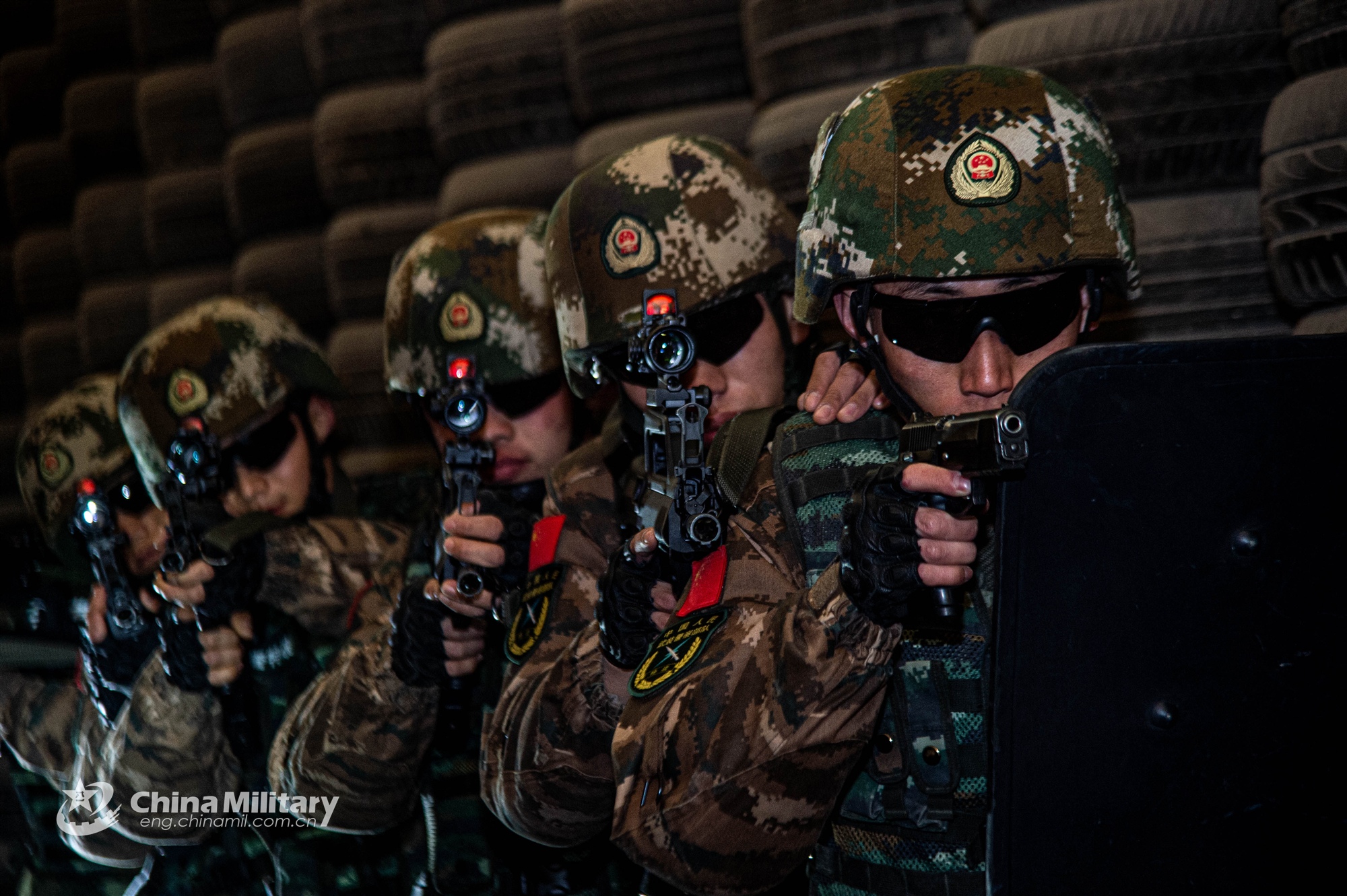 Special operations soldiers assigned to a detachment under the Chinese People’s Armed Police (PAP) Force Tianjin Contingent advance and reconnoiter with aimed rifles in assault group during the comprehensive counter-hijacking training on March 4, 2021. (eng.chinamil.com.cn/Photo by Qian Zhiqiang)