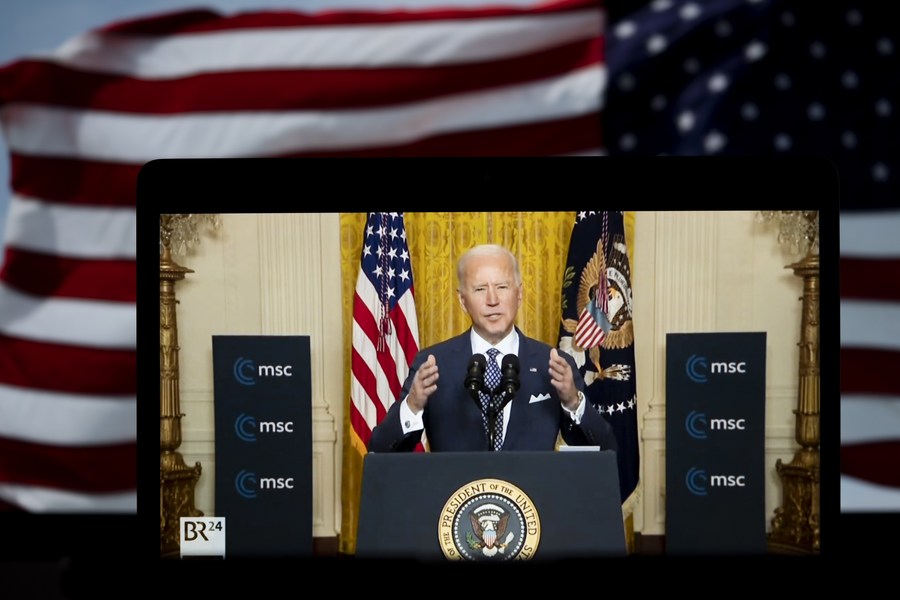 Photo taken in Arlington, Virginia, the United States, on Feb. 19, 2021 shows a screen displaying U.S. President Joe Biden speaking in Washington, D.C. during a virtual event with the Munich Security Conference in a video provided by the U.S. State Department. (Xinhua/Liu Jie)
