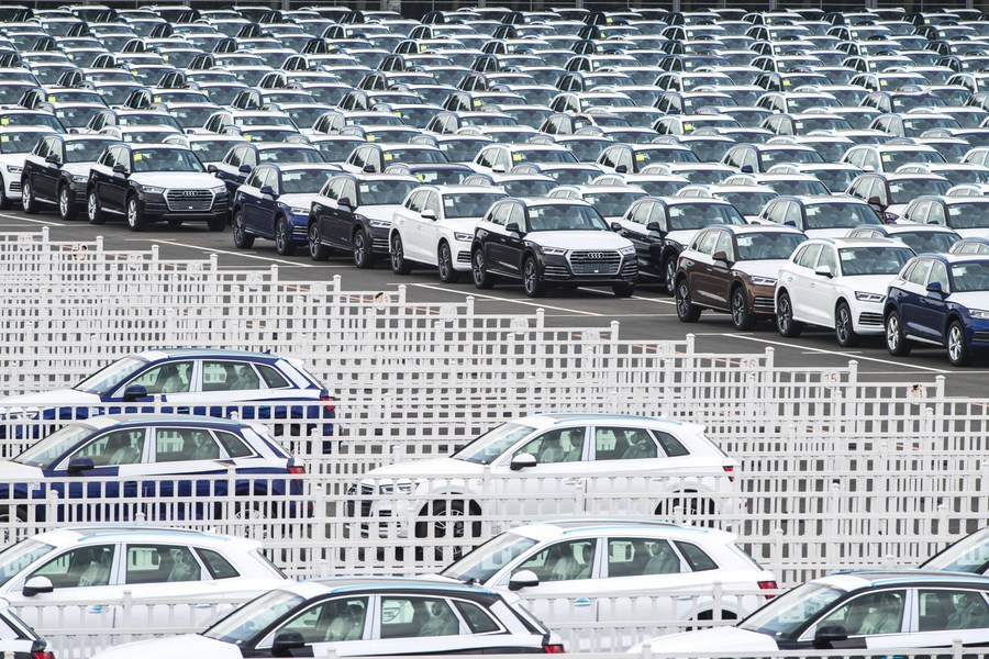 Photo taken on July 9, 2019 shows Audi vehicles awaiting transfer at the parking lot of FAW-Volkswagen in Changchun, northeast China's Jilin Province.(Xinhua/Xu Chang)