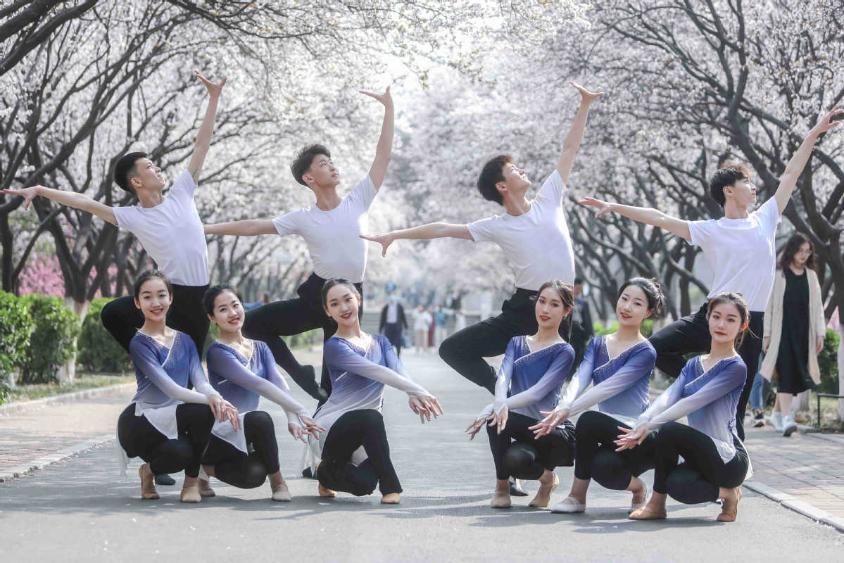 A group of students from the School of Music of Shandong Normal University are seen dancing at the Qianfo Mountain Campus in Jinan, East China's Shandong province against a backdrop of various blooming flowers. [Photo provided to chinadaily.com.cn]