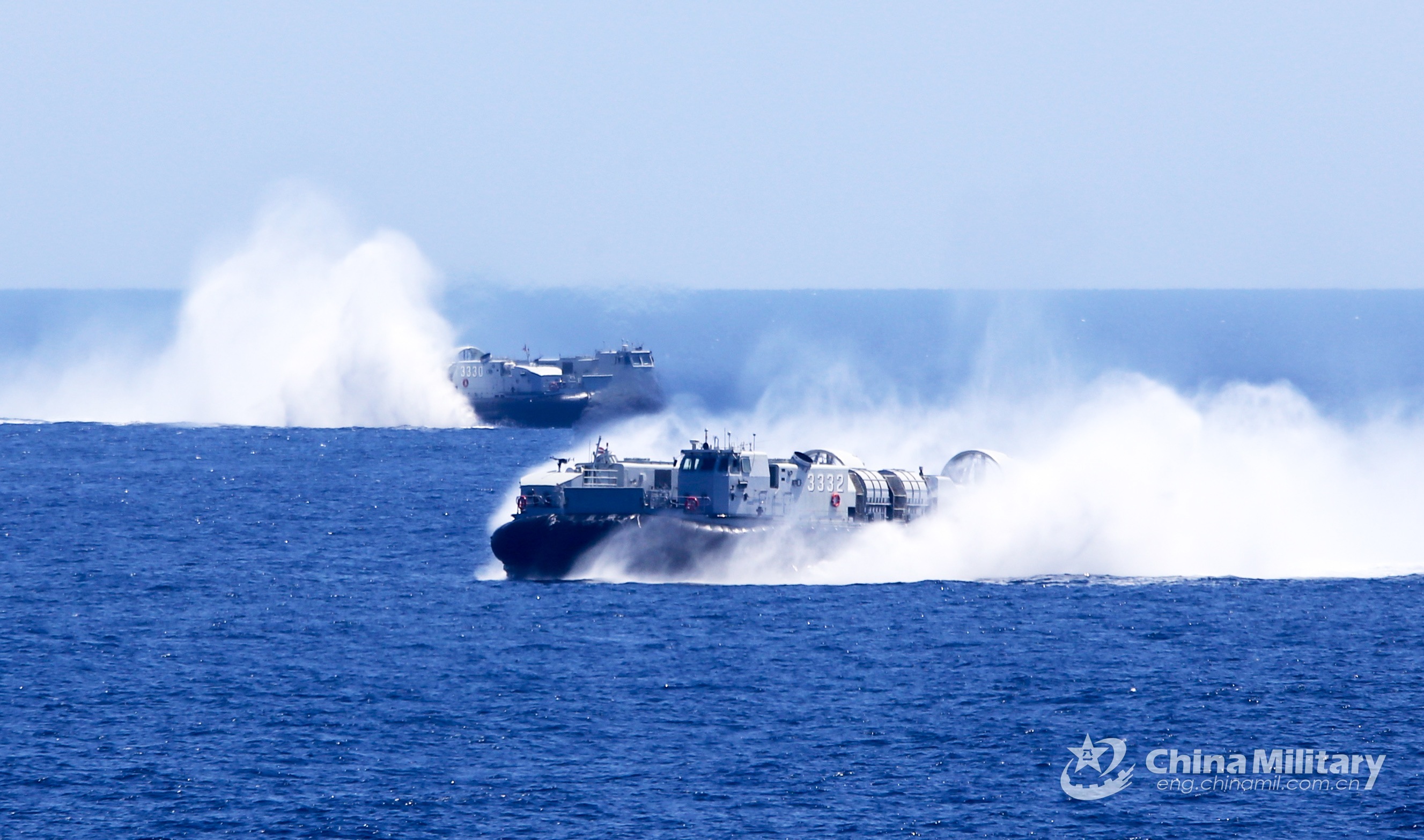 Air-cushion landing crafts attached to a naval landing ship detachment under the PLA Southern Theater Command sails through wind in formation during the actual combat training in late February, 2021. (eng.chinamil.com.cn/Photo by Qiao Chenxi)