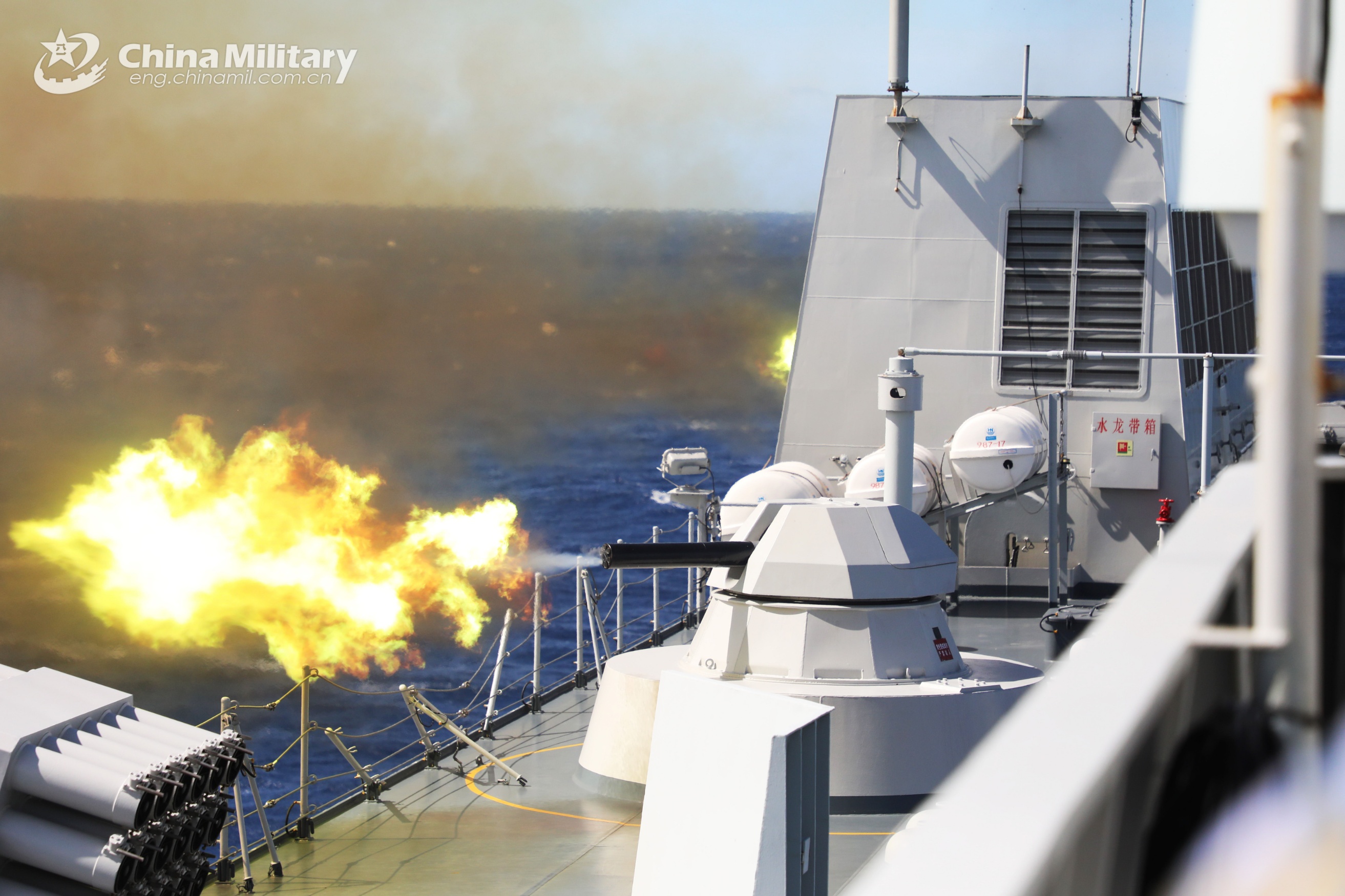 The close-in weapon system of the amphibious dock landing ship Wuzhishan (Hull 987) fires at the mock target at sea during the actual combat training organized by a naval landing ship flotilla under the PLA Southern Theater Command in late February, 2021. (eng.chinamil.com.cn/Photo by Qiao Chenxi)