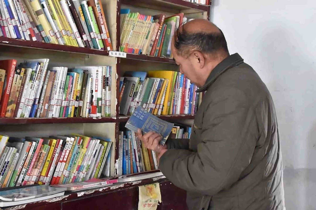 A resident selects a book at Du Dejian's home library. [Photo provided to chinadaily.com.cn]