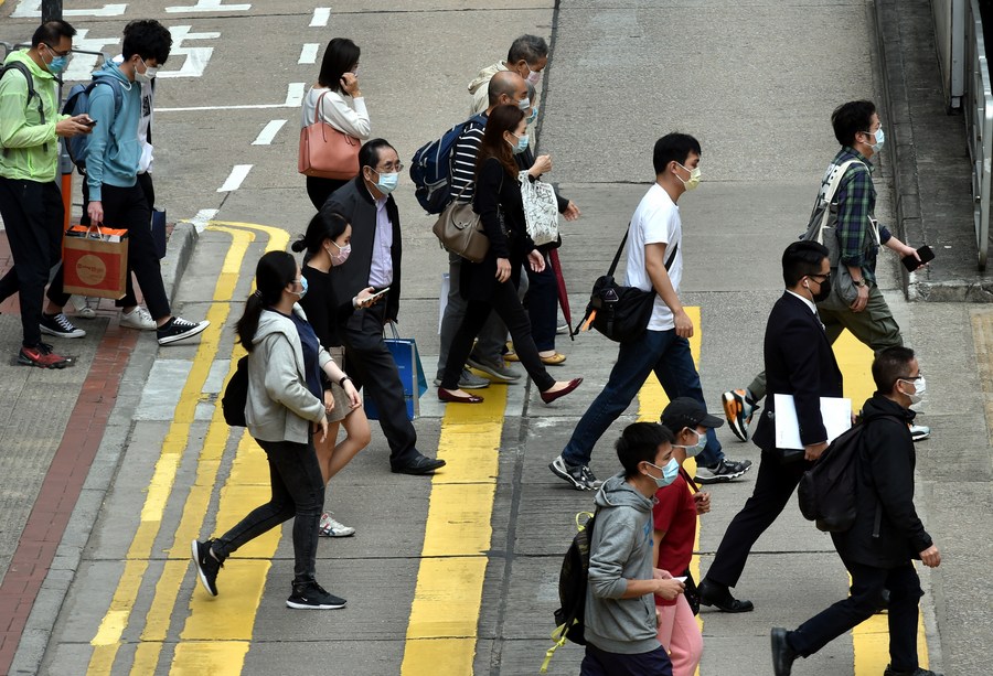 People wearing masks walk on the street in south China's Hong Kong, March 1, 2021. (Photo by Lo Ping Fai/Xinhua)