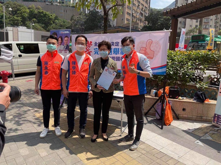 Chief Executive of the Hong Kong Special Administrative Region Carrie Lam (2nd R) shows her signature during a campaign in support of the decision on improving the electoral system of the HKSAR by the National People's Congress in Hong Kong, south China, March 15, 2021. (Xinhua)