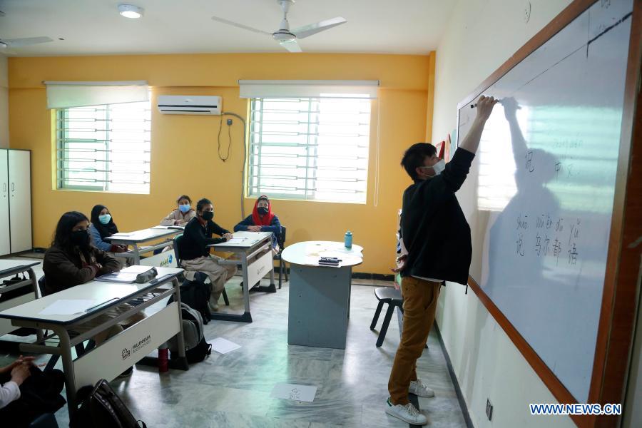 Students attend a Chinese language class at a campus of the Roots Millennium Schools in Islamabad, Pakistan, on March 11, 2021. Currently, there are five Confucius Institutes and two Confucius Classrooms across Pakistan. According to the Pakistani think-tank Pakistan-China Institute, between 26,000 and 30,000 students are studying the Chinese language at various levels in Pakistan. (Xinhua/Ahmad Kamal)