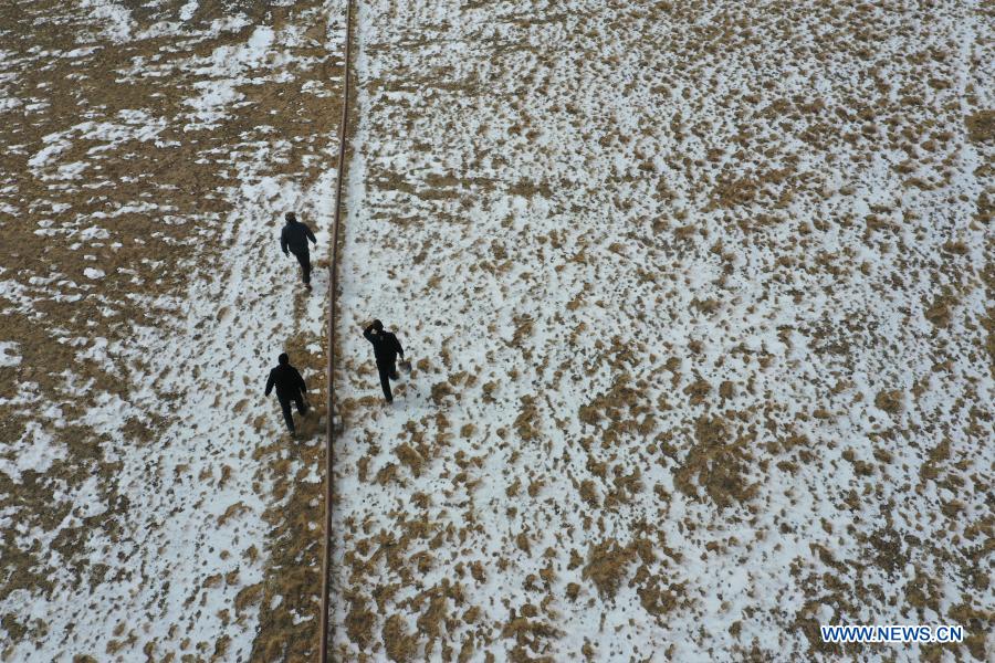 Aerial photo taken on March 20, 2021 shows Gu Zhengli and his colleagues on the way of an inspection tour in Dahe Township, Yugu Autonomous County of Sunan, northwest China's Gansu Province. Gu Zhengli, 59, has been working at the frontline of Tanggaer water conservancy project in Dahe Township for 42 years, safeguarding the safety of the drinking water for local people and livestock. As the annual rainfall in the town is only 150 to 300 millimeters, Tanggaer water conservancy project is literally the lifeline for local herdsmen. Every morning, Gu gets up early and operates a pump to move water from the pumping station at the foot of the mountain to a reservoir at the top. Then he climbs to the top of the mountain at about 7 o'clock and opens the valve, letting the water in the reservoir flow to each water supply point through 7 pipelines. After that, he rides a motorcycle to 52 water supply points to check if everything runs well. In the past 42 years, Gu has been working like this. Local herdsmen always see him busy on the way along the water conservancy project. Thanks to the efforts of Gu and his colleagues, people in the area now can not only enjoy much safer water but also achieve a balance between grass and livestock ahead of schedule. At a drinking well along the water conservancy project, local herdsmen wrote a sign which says "When drinking water, do not forget the well diggers", to show their gratitude. Every time Gu passes by the sign, he stops for a moment as he feels happy his work is recognized in this way. "I am the son of a herdsman. It is my responsibility to let herdsmen have the access to safe water." Gu always say so. (Xinhua/Du Zheyu)