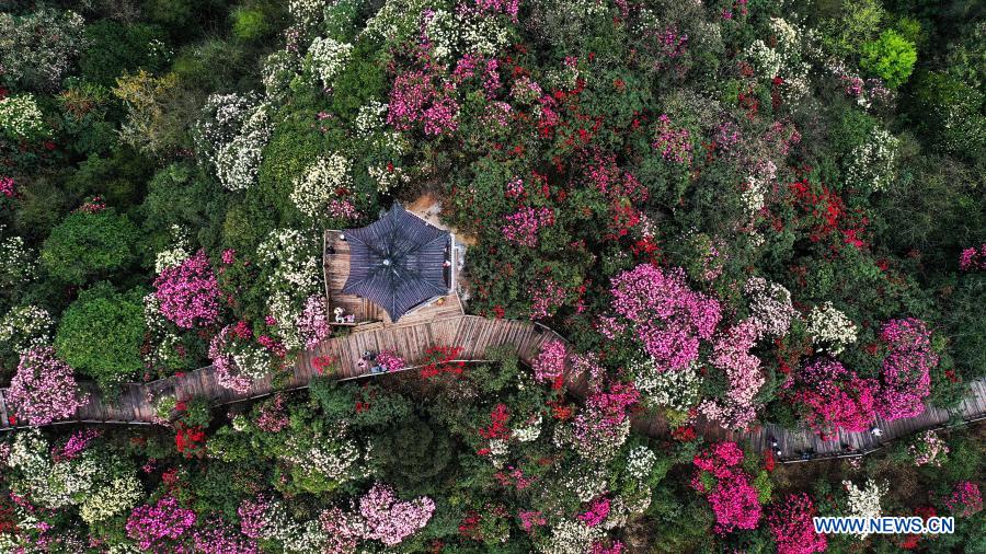 Aerial photo taken on March 21, 2021 shows tourists viewing azalea flowers at Pudi scenic spot in Bijie City, southwest China's Guizhou Province. Over 120 square kilometers of azalea flowers here have entered blooming season recently, attracting many people to visit. (Xinhua/Yang Wenbin)