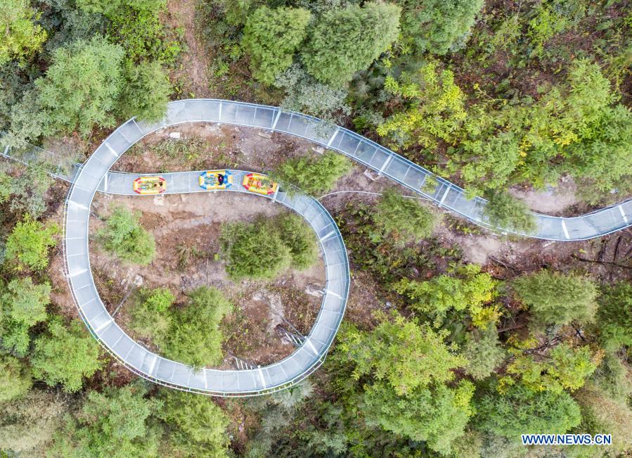 Aerial photo shows tourists drifting on water at a scenic spot in Maoping township of Zigui county, central China's Hubei Province, March 21, 2021. (Photo by Zheng Jiayu/Xinhua)