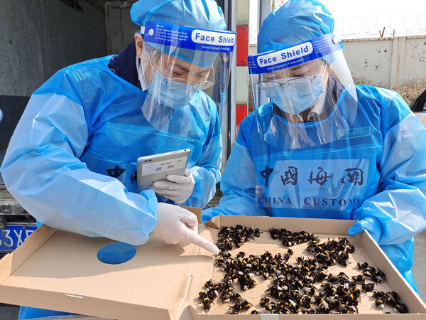 Officers from Qingdao Customs in Qingdao, east China's Shandong province, check bumblebees imported for artificial pollination at vegetable greenhouses. (Photo/Science and Technology Daily)