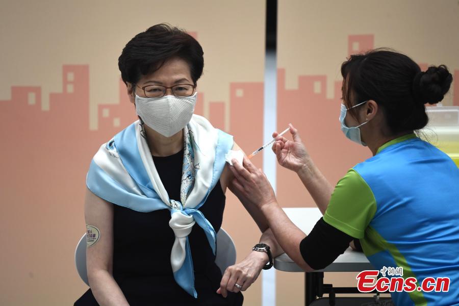 Chief Executive of the Hong Kong Special Administrative Region (HKSAR) Carrie Lam gets her second COVID-19 jab, March 22, 2021. Lam and other senior HKSAR officials received their second dose of the COVID-19 vaccine developed by China's Sinovac Biotech on Monday. The vaccination is the most effective way to combat the pandemic, the Chief Executive said, calling for Hong Kong citizens who has already got the first jab to receive the second does on schedule. Hong Kong?has rolled out its mass?vaccination?program?for about one month, with 350,000 people getting vaccinated, Lam said. (Photo: China News Service/Li Zhihua)