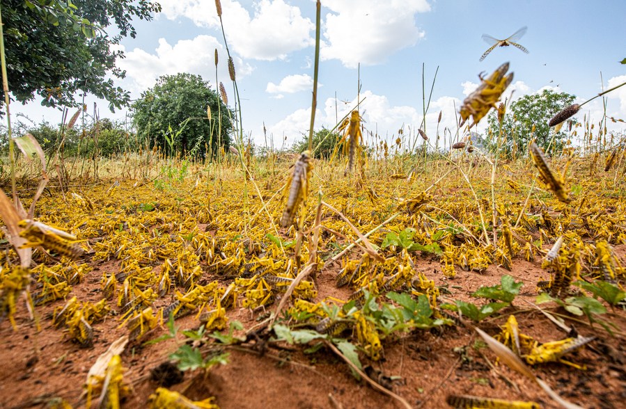 A swarm of desert locusts invade parts of Mwingi Town in Kitui County, Kenya, on Feb. 20, 2020. (Xinhua/Zhang Yu)