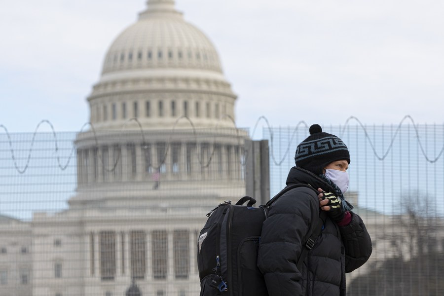 A man wearing a face mask walks past the U.S. Capitol building in Washington, D.C., the United States, Jan. 24, 2021. (Photo by Aaron Schwartz/Xinhua)