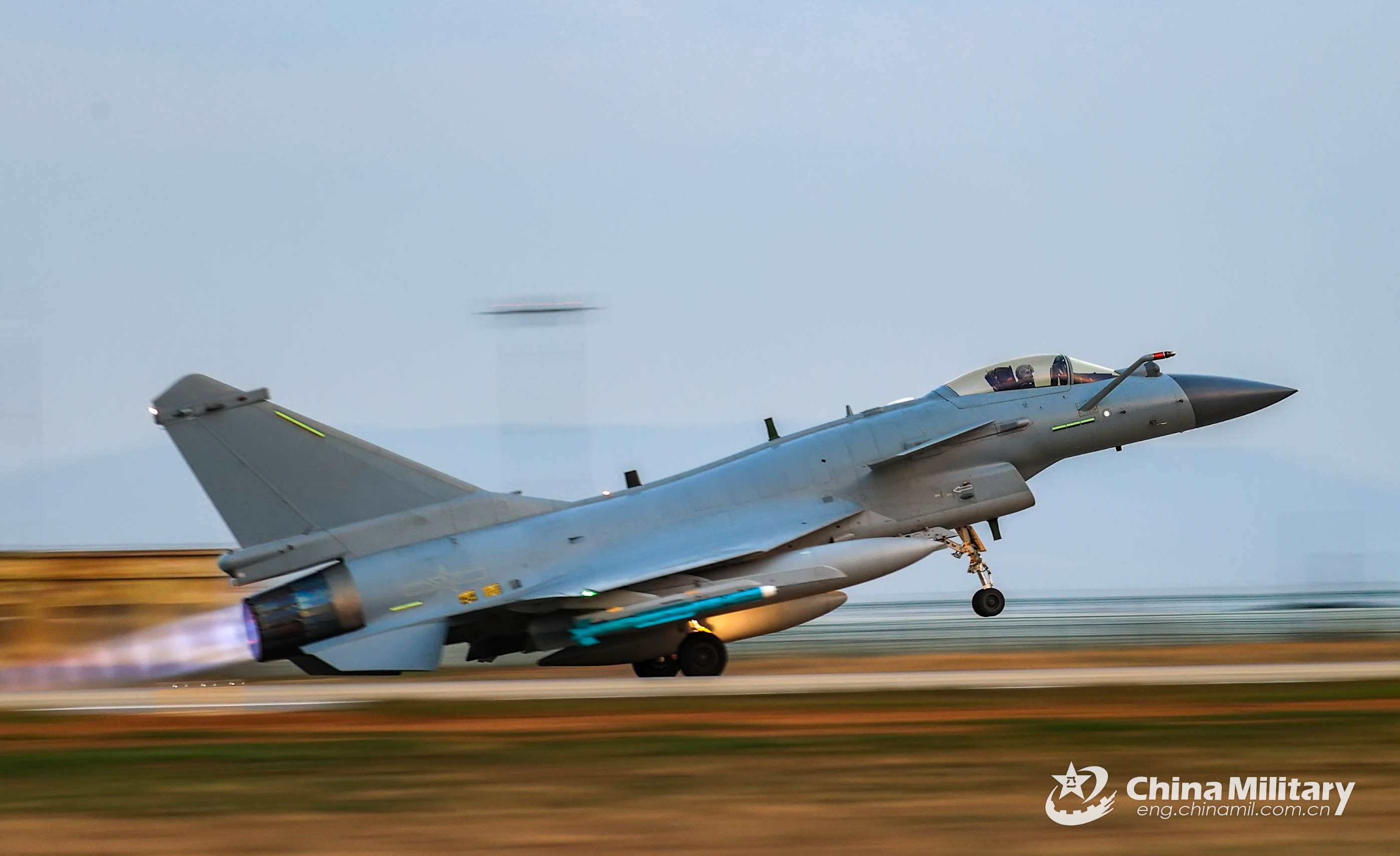 A fighter jet attached to an air force aviation brigade under the PLA Southern Theater Command takes off during a round-the-clock flight training exercise on March 4, 2021. (eng.chinamil.com.cn/Photo by Wang Guoyun)