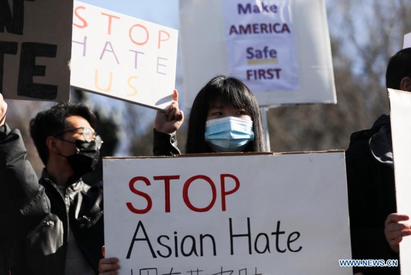 People take part in a protest against Asian hate in New York, the United States, on March 21, 2021. Eight people, six Asians and two Whites, were killed in shooting incidents in the Atlanta area by a suspect this week. The attacks came amid a troubling spike in violence against the Asian American community during the coronavirus pandemic. (Xinhua/Wang Ying)