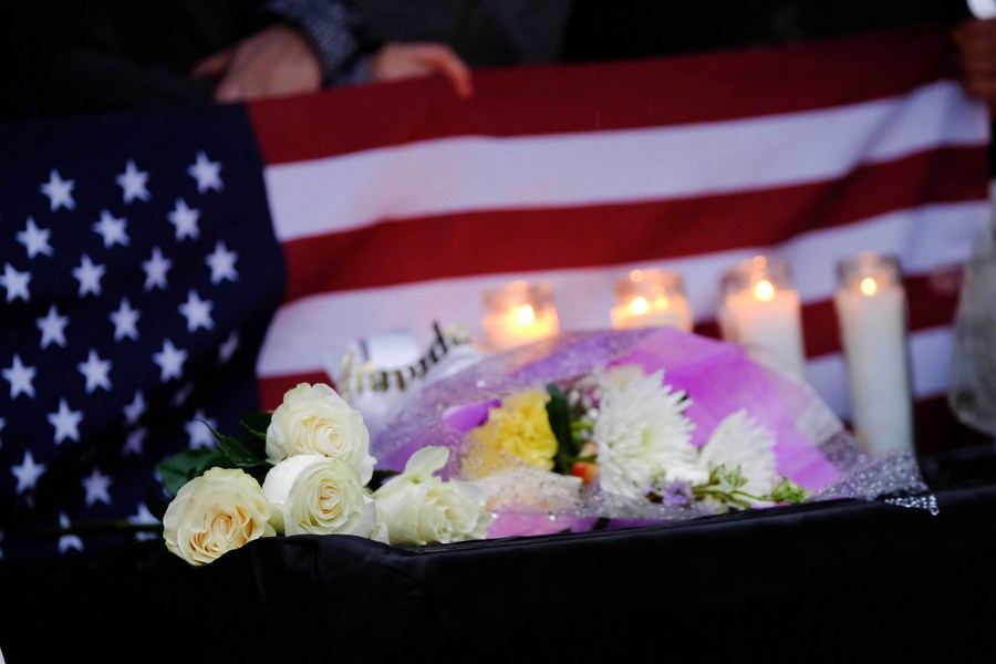 Flowers and candles are seen during an event to honor the victims of the shootings in the Atlanta Metropolitan area, in New York, the United States, March 18, 2021. (Ed Reed/Mayoral Photography Office/Handout via Xinhua)