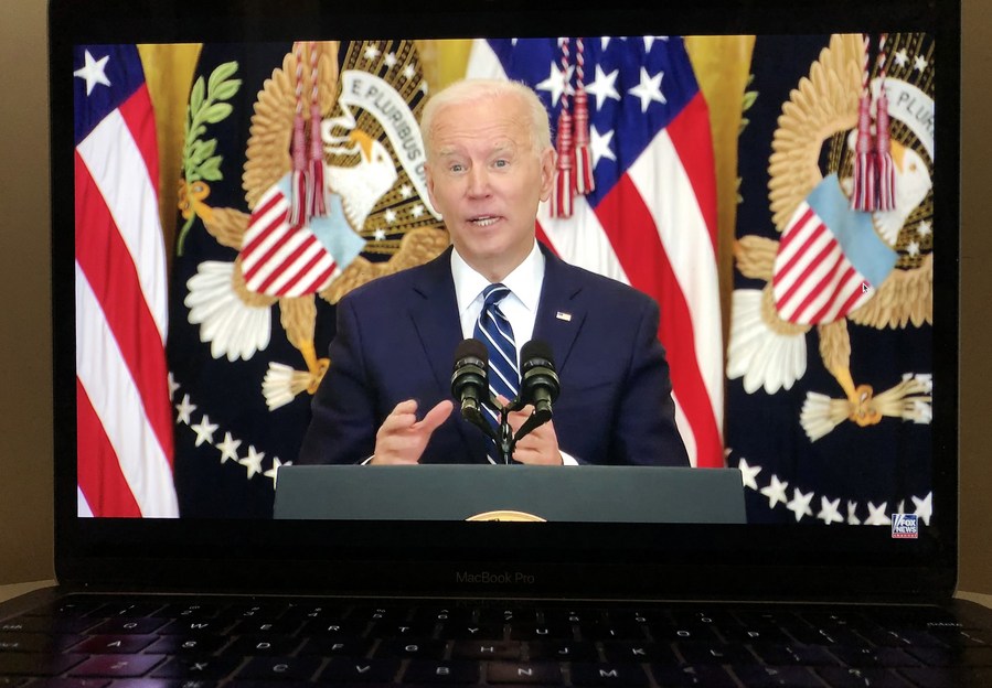 Photo taken in Arlington, Virginia, the United States, on March 25, 2021 shows a screen displaying U.S. President Joe Biden speaking during a press conference in Washington, D.C., in a live stream provided by Fox News. (Xinhua/Liu Jie)
