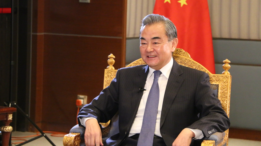 Chinese State Councilor and Foreign Minister Wang Yi speaks during an interview with Al-Arabiya TV channel in Riyadh, Saudi Arabia, March 24, 2021. /Chinese Foreign Ministry