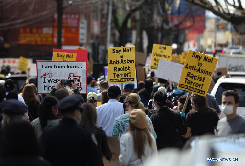 People march against racism and violence on Asian Americans in Flushing of New York, the United States, March 27, 2021. (Xinhua/Wang Ying)
